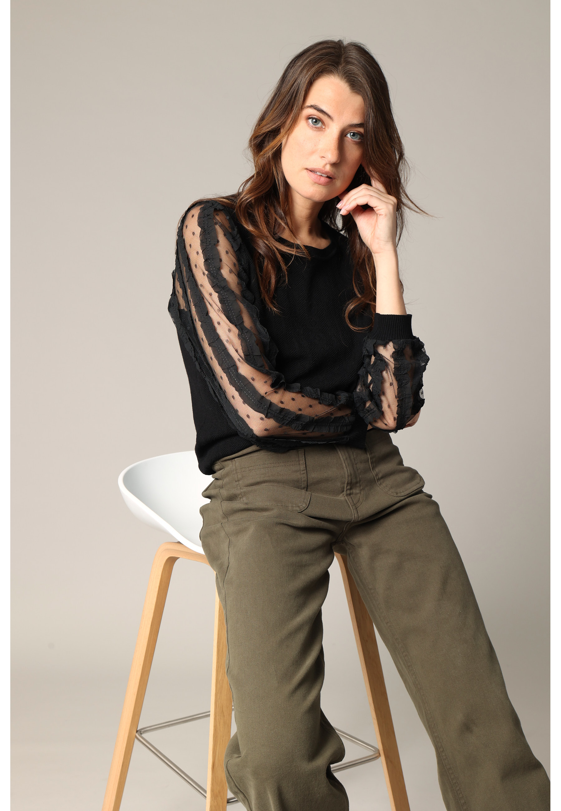 Le modèle EDWIGE sublime la silhouette avec raffinement grâce à ses manches en tulle délicatement brodé de pois et rehaussé de rubans en relief. Sa coupe ajustée et son encolure ronde offrent un équilibre parfait entre sobriété et sophistication. Pensé pour la femme moderne, ce pull joue sur la transparence avec subtilité, tout en conservant une ligne épurée. Un choix élégant pour sublimer un pantalon tailleur ou twister un denim foncé avec style.