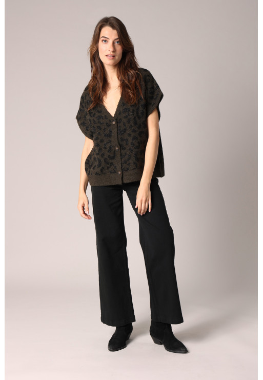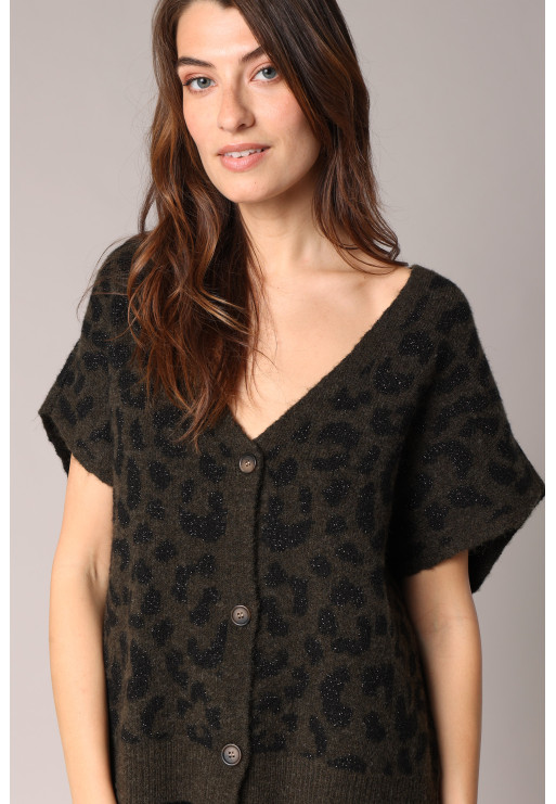 Le gilet NERILE sans manches pour femme revisite avec audace le cardigan classique grâce à un imprimé léopard irrésistiblement glamour. Sa coupe ample et sa maille douce offrent un confort absolu tout en apportant une allure affirmée. Porté seul ou superposé à une chemise ou un sous-pull, il signe une silhouette à la fois tendance et subtilement sauvage. Le jeu de boutons à l’avant ajoute une touche de raffinement, tandis que les déclinaisons de couleurs permettent de varier les styles selon vos envies. Un modèle qui insuffle une dose d’audace à vos looks, en journée comme en soirée.