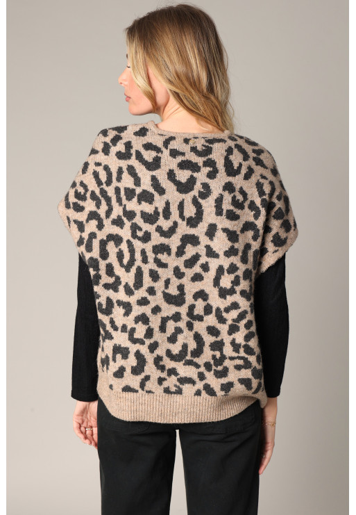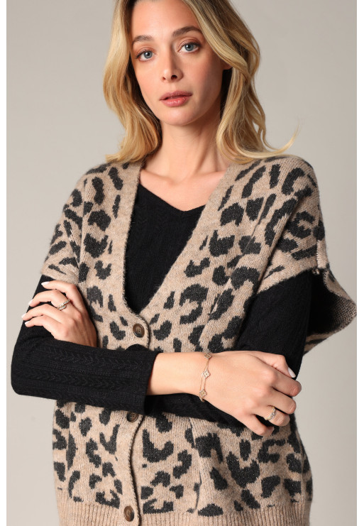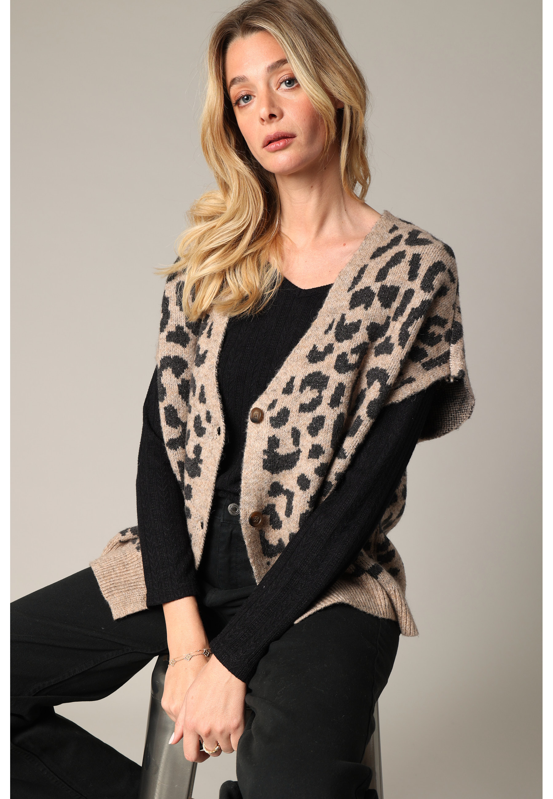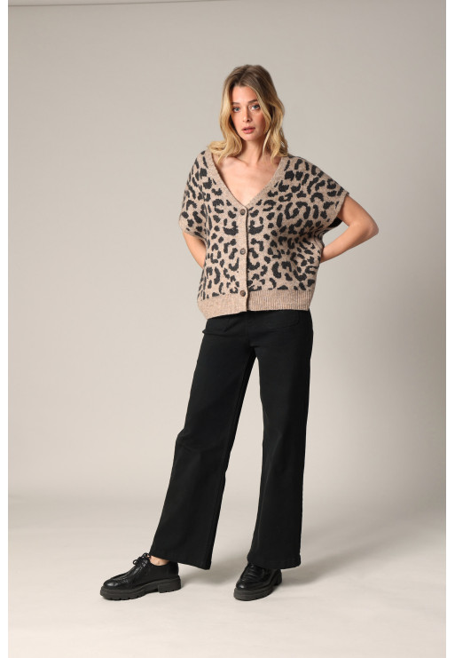 Le gilet NERILE sans manches pour femme revisite avec audace le cardigan classique grâce à un imprimé léopard irrésistiblement glamour. Sa coupe ample et sa maille douce offrent un confort absolu tout en apportant une allure affirmée. Porté seul ou superposé à une chemise ou un sous-pull, il signe une silhouette à la fois tendance et subtilement sauvage. Le jeu de boutons à l’avant ajoute une touche de raffinement, tandis que les déclinaisons de couleurs permettent de varier les styles selon vos envies. Un modèle qui insuffle une dose d’audace à vos looks, en journée comme en soirée.