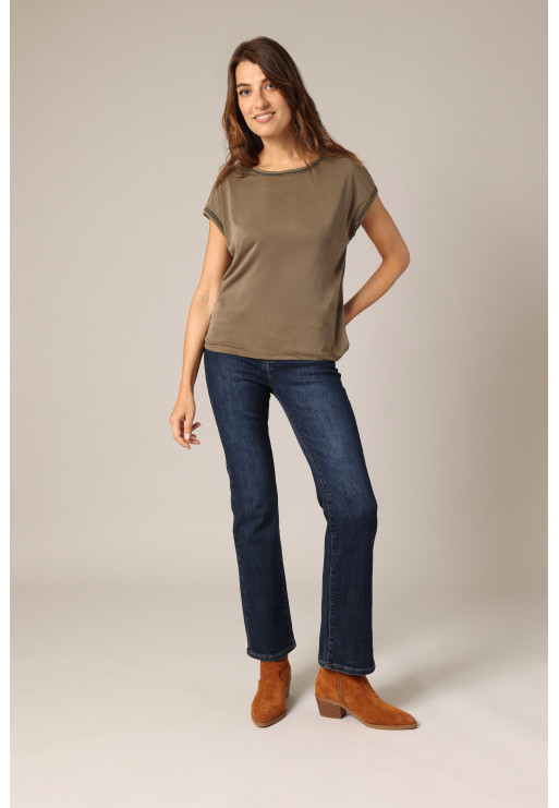 Ce t-shirt à la coupe droite et fluide séduit par sa simplicité élégante. Son col rond et ses manches courtes sont soulignés de détails brodés ton sur ton, ajoutant une touche raffinée au modèle. Léger et confortable, il se prête à toutes les occasions du quotidien.