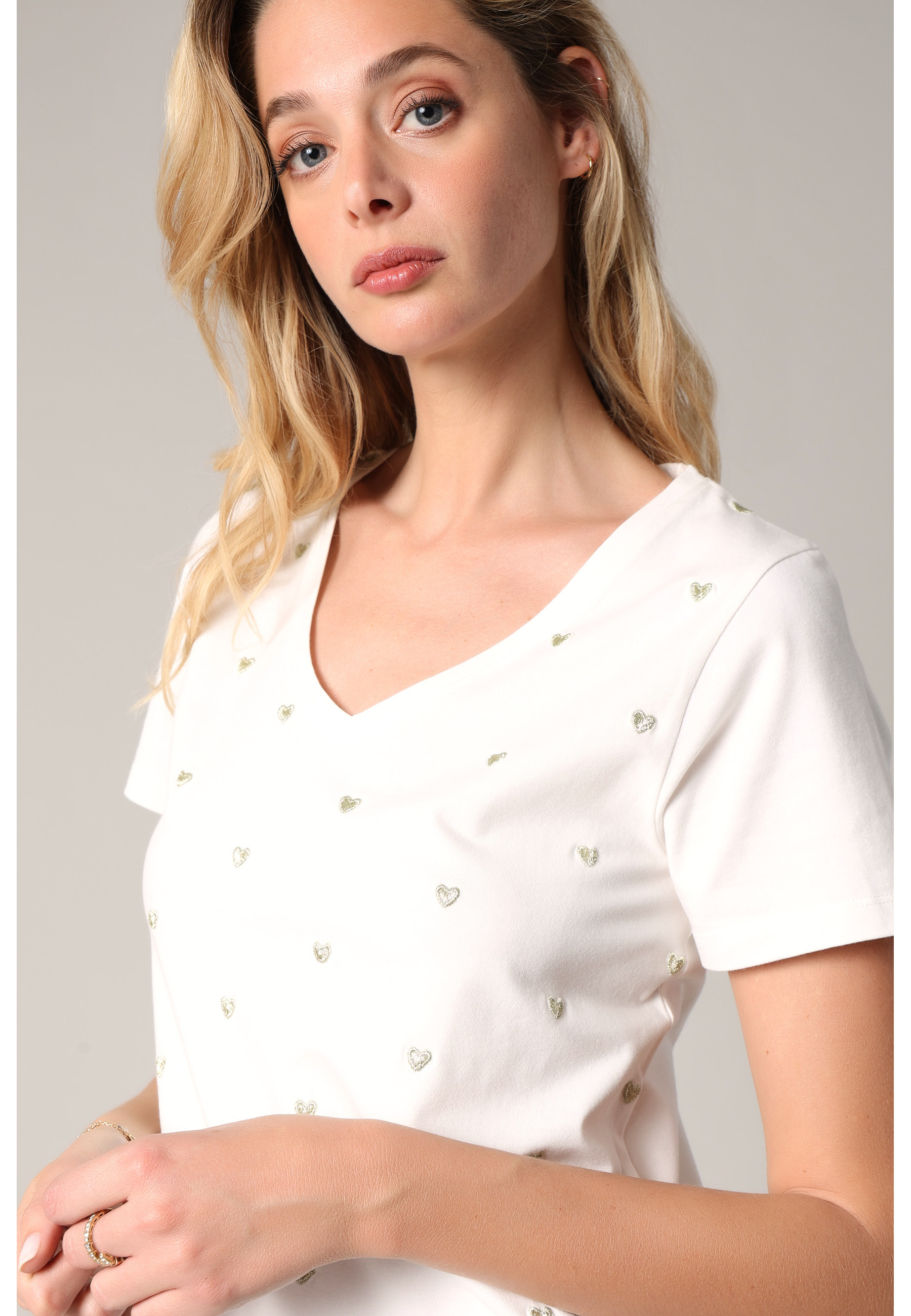 Adoptez un style romantique et casual avec ce t-shirt à col V, entièrement orné de broderies en forme de cœur délicates. Sa matière en 95% coton apporte un confort optimal tout au long de la journée. Les manches courtes et la coupe droite offrent une silhouette épurée, facile à associer avec un jean, une jupe ou un pantalon tailleur.