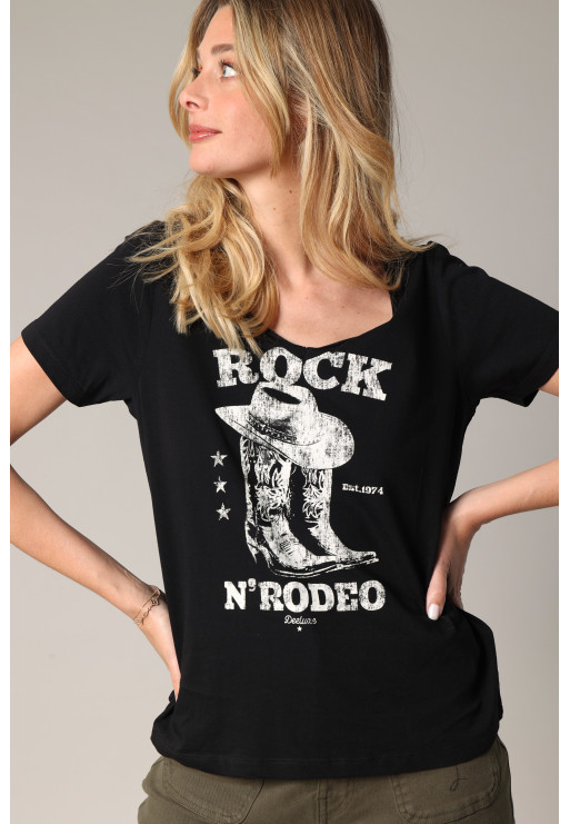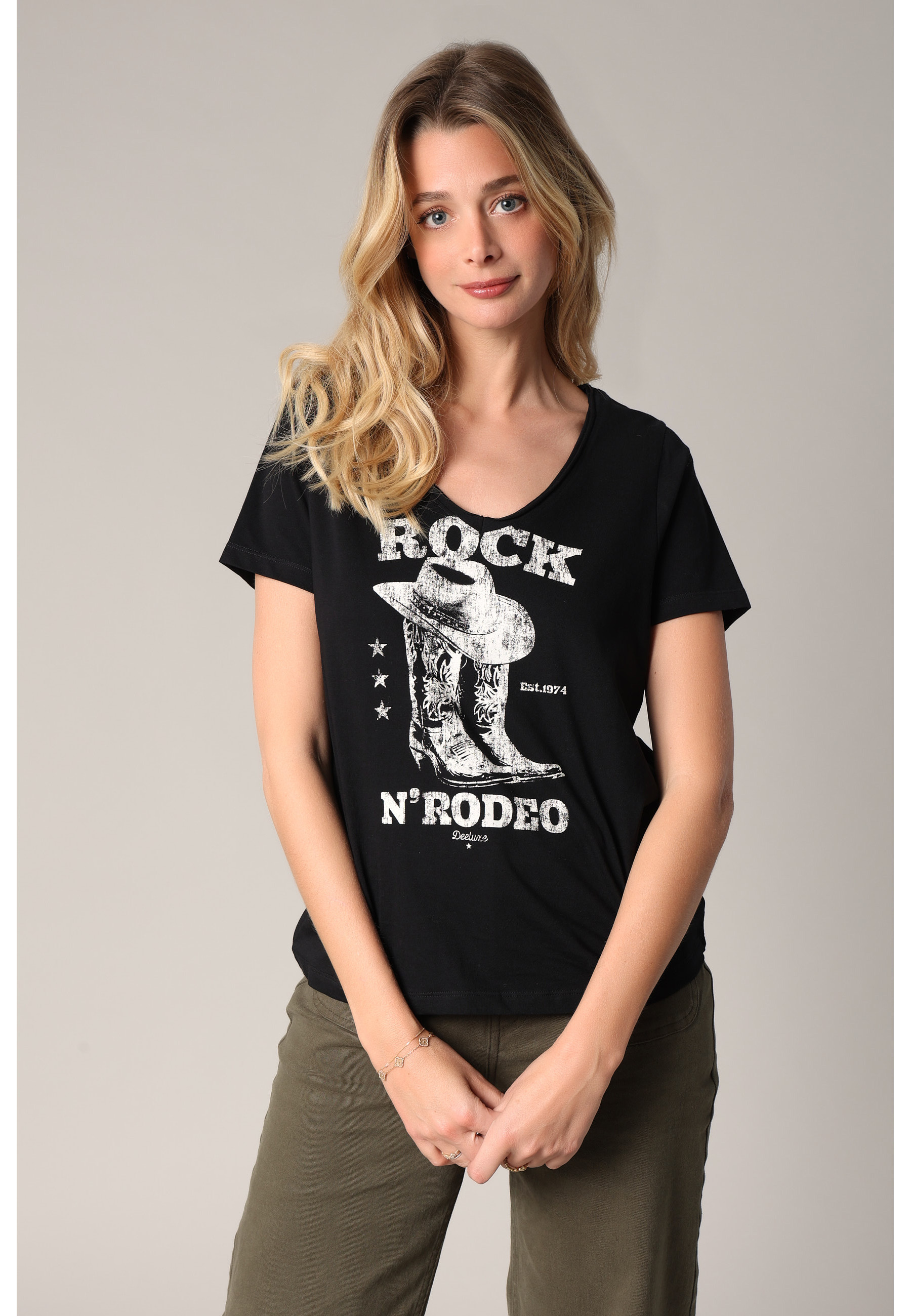 Le modèle RODEO à col en V incarne un look western moderne avec son imprimé audacieux représentant des bottes et un chapeau typiques du Far West. Conçu dans une coupe droite et fluide, il assure un confort optimal au fil de la journée. Sa matière douce et agréable en fait une pièce facile à associer à un jean ou à un short pour une allure décontractée mais stylée. Idéal pour insuffler un vent d’aventure dans vos tenues du quotidien.
