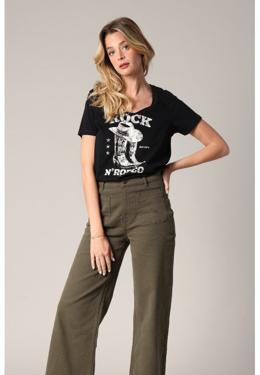 Le modèle RODEO à col en V incarne un look western moderne avec son imprimé audacieux représentant des bottes et un chapeau typiques du Far West. Conçu dans une coupe droite et fluide, il assure un confort optimal au fil de la journée. Sa matière douce et agréable en fait une pièce facile à associer à un jean ou à un short pour une allure décontractée mais stylée. Idéal pour insuffler un vent d’aventure dans vos tenues du quotidien.