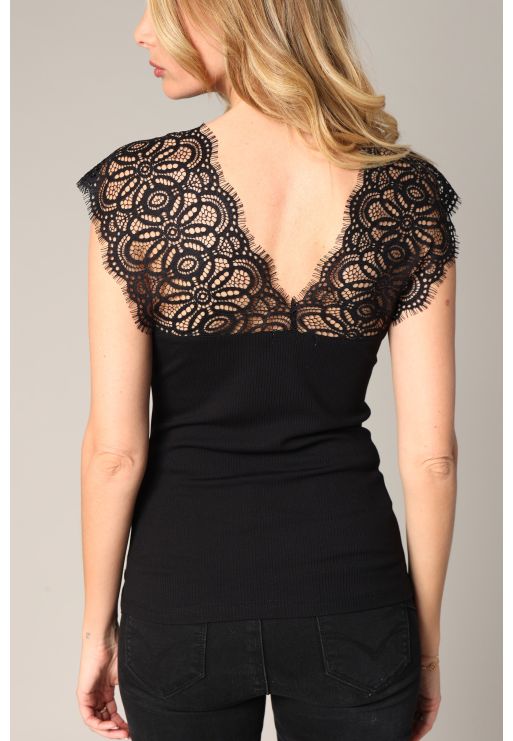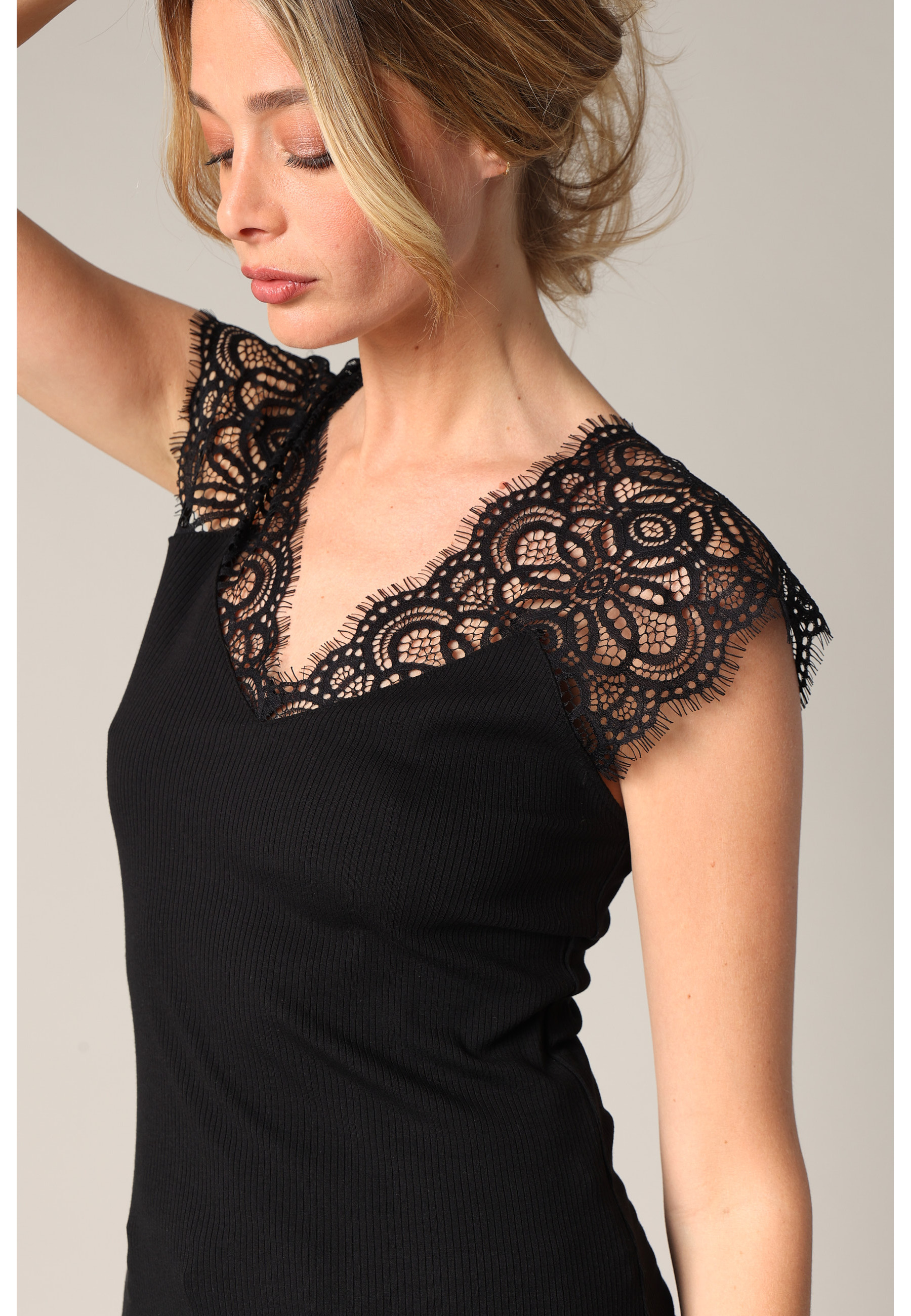 Le top BRIVIA séduit par sa délicatesse et ses finitions élégantes. Ce modèle sans manches mise sur un contraste raffiné entre un corps en maille côtelée ajustée et des empiècements en dentelle ajourée aux épaules. Le col en V, devant comme au dos, met en valeur le port de tête avec subtilité. À la fois féminin et intemporel, ce top s’associe aussi bien à une jupe fluide qu’à un pantalon structuré pour composer des tenues sobres ou habillées selon l’occasion.