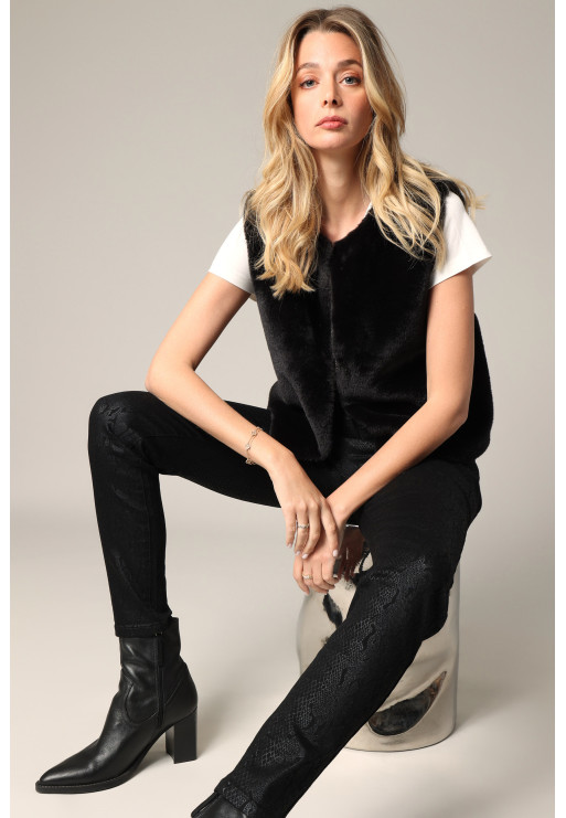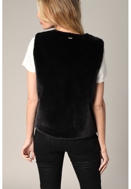 Le gilet sans manches FUZZY en imitation fourrure au toucher ultra doux est idéal pour réchauffer une tenue avec élégance. Sa coupe droite, sans col, épouse la silhouette avec simplicité tout en apportant une touche cocooning chic. Le modèle se ferme discrètement sur le devant pour un effet épuré. Parfait en superposition sur un pull léger ou une chemise fluide, il s’adapte à toutes les saisons.