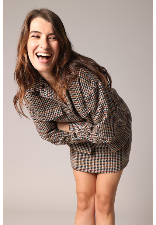 La veste LITCHI vous embarque dans un voyage à carreaux entre vintage assumé et modernité confortable. Son motif pied-de-poule multicolore donne du relief à chaque look, tandis que son col moutonné vous chuchote des mots doux à l’oreille lors des journées fraîches. Elle s’ouvre avec de larges boutons noirs pour un effet visuel fort, et affiche fièrement deux poches plaquées à rabat sur la poitrine, parfaites pour un soupçon de style et un brin de praticité. Sa coupe structurée flatte la silhouette, que vous la portiez en duo avec sa jupe assortie ou en solo sur un jean.