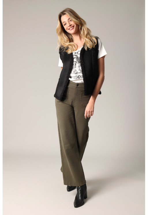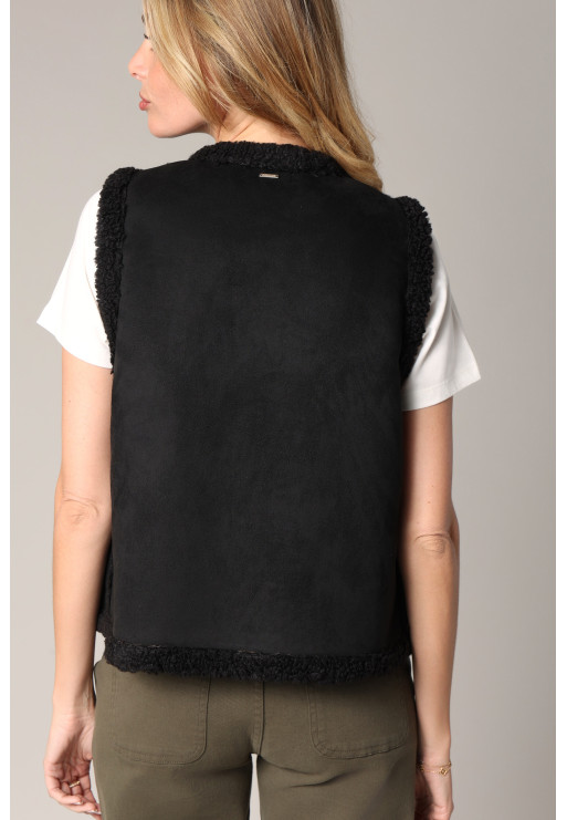 Le gilet SVANY réinterprète le style folk avec modernité. Conçu dans une matière effet peau retournée, il est bordé d’une finition sherpa qui apporte à la fois chaleur et contraste visuel. Sa coupe sans manches et ouverte sur le devant le rend facile à superposer sur un t-shirt imprimé ou une chemise, pour une allure casual chic au fil des saisons. Il s’impose comme une pièce originale et confortable pour dynamiser votre vestiaire avec style.