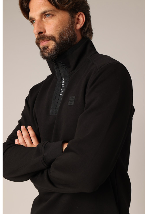 Ce sweat présente un col montant zippé contrastant, orné d’un liseré imprimé “DEELUXE” et d’un empiècement ton sur ton au niveau de la fermeture.