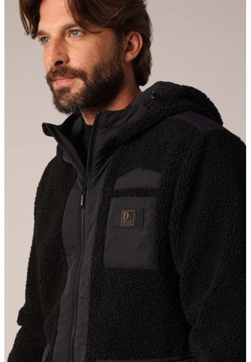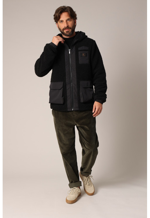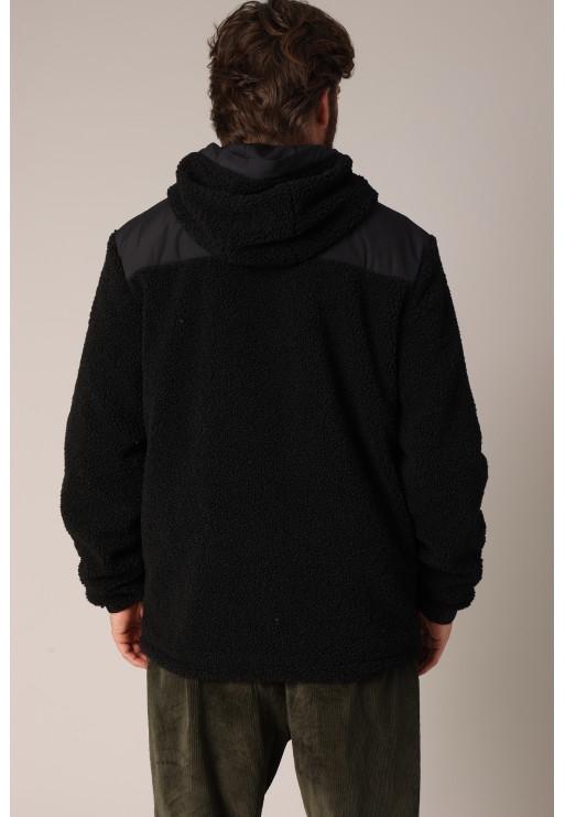 Confectionnée dans une matière effet sherpa douce et moelleuse, elle séduit par sa capuche intégrée, ses épaules renforcées en tissu contrastant et ses détails techniques.