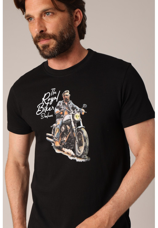 Le t-shirt ROYAL pour homme incarne l’esprit biker avec un visuel frontal audacieux représentant un motard barbu en pleine chevauchée. Il séduit par sa coupe droite classique et son col rond indémodable. Entièrement confectionné en coton, il garantit un confort optimal tout au long de la journée. L’imprimé soigné donne du caractère à la pièce tout en restant facile à associer. À porter sous une veste en cuir ou avec un jean brut pour un style viril et assumé.