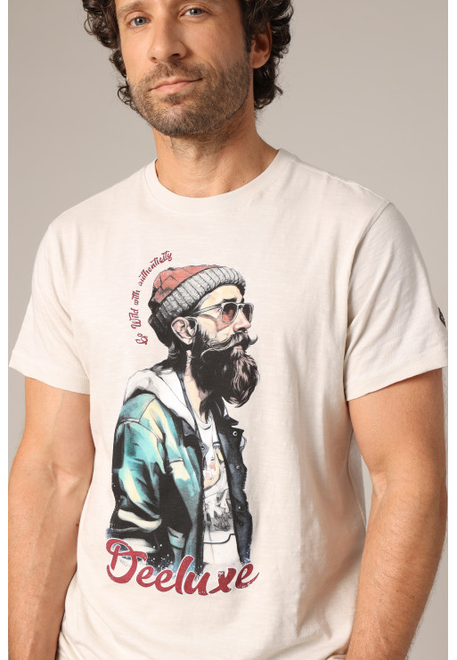 T-shirt homme HIPSTER 100% coton, ultra stylé avec son imprimé graphique sur le devant représentant un personnage barbu au look rétro-urbain. Ce modèle casual affiche une coupe droite classique, un col rond et des manches courtes. Le visuel audacieux, associé à l'inscription "Deeluxe", apporte une touche fun et décalée à votre tenue. Parfait pour affirmer votre style streetwear avec une pointe d'humour et de créativité. Confortable et respirant, il s'impose comme un basique plein de caractère à intégrer dans votre dressing d’été.