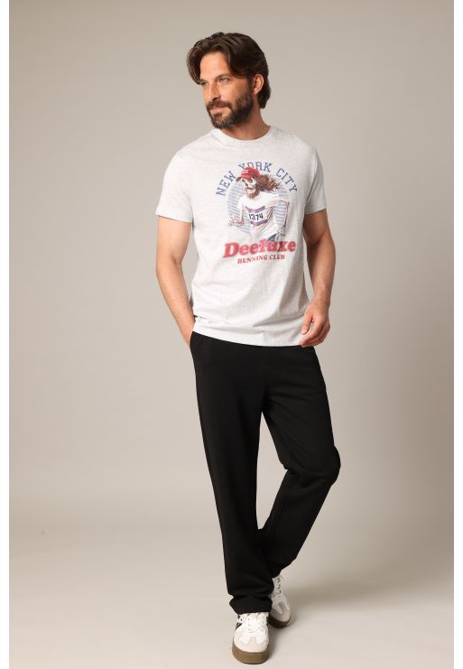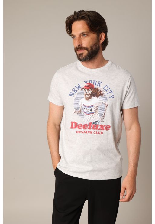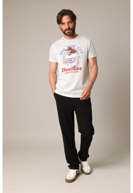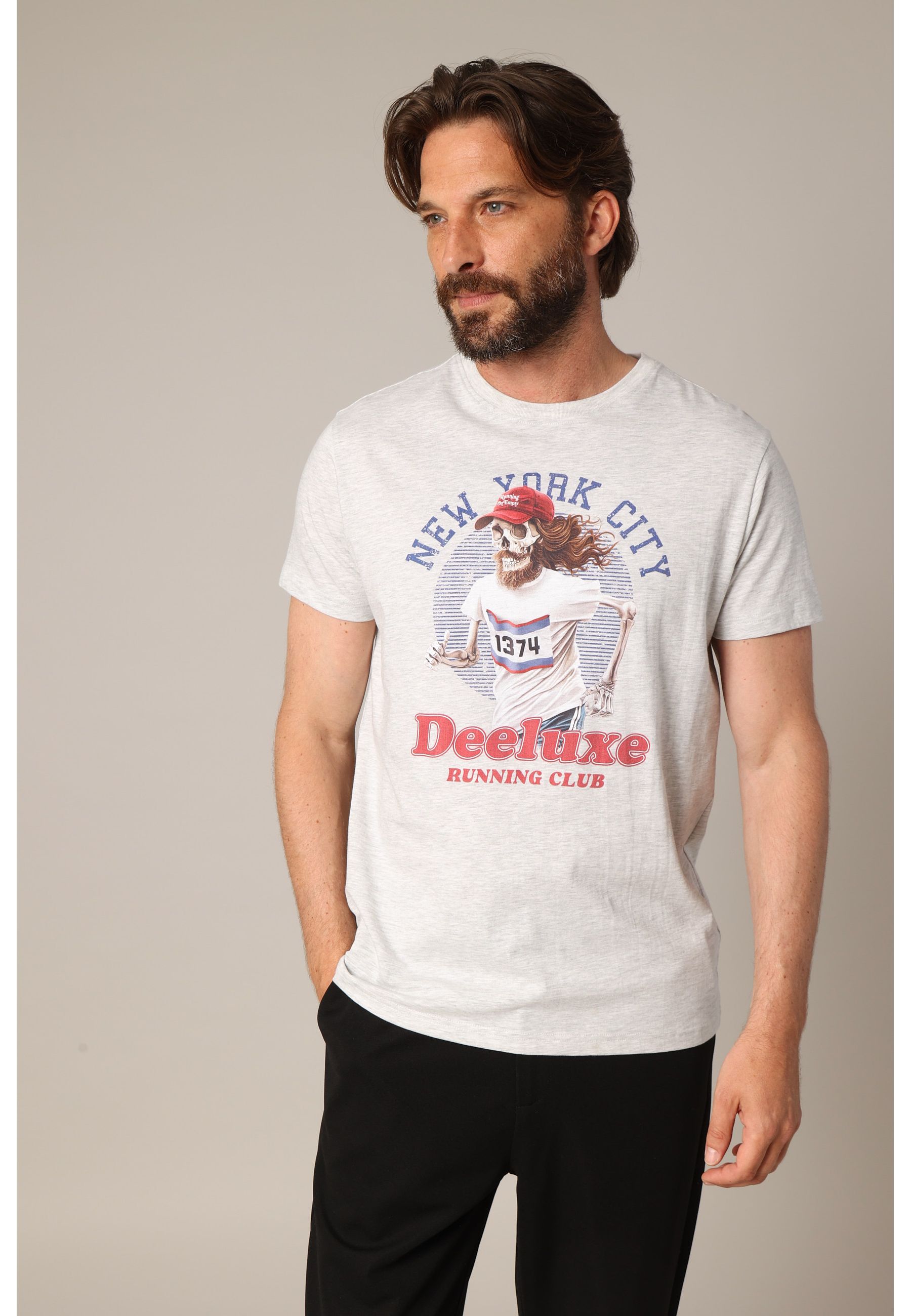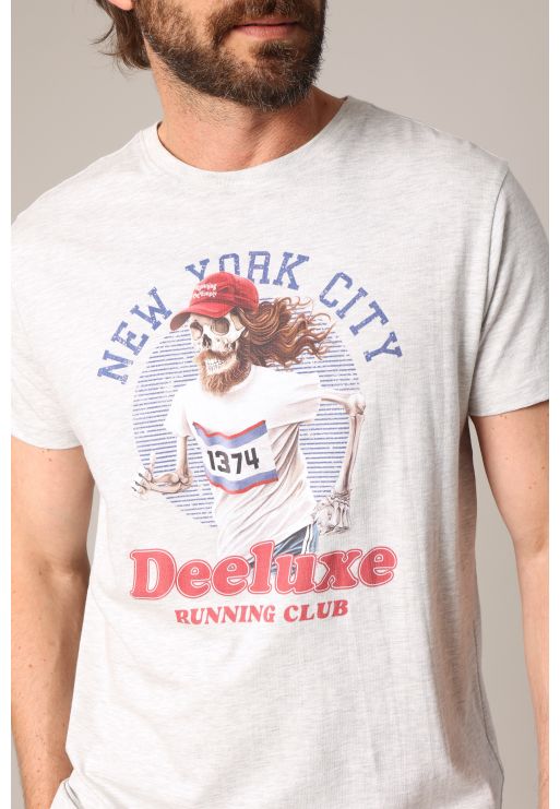 Ce t-shirt RUNNING à manches courtes revisite l’univers du running à travers un visuel original et décalé : un squelette barbu en plein effort, coiffé d’une casquette “Running on empty”, le tout encadré par la mention “New York City” et le logo Deeluxe Running Club. Disponible en plusieurs coloris, il adopte une coupe droite confortable et un col rond classique. Idéal pour ajouter une touche d’humour (et d’os) à vos looks urbains ou détendus.