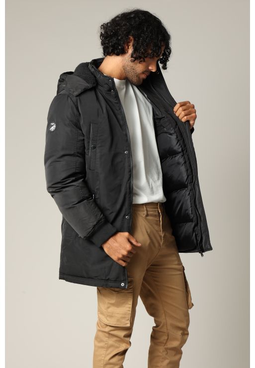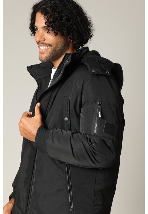 La capuche, en matière douce et chaude, est équipée de pressions et peut être retirée à l'aide d'une fermeture éclair.