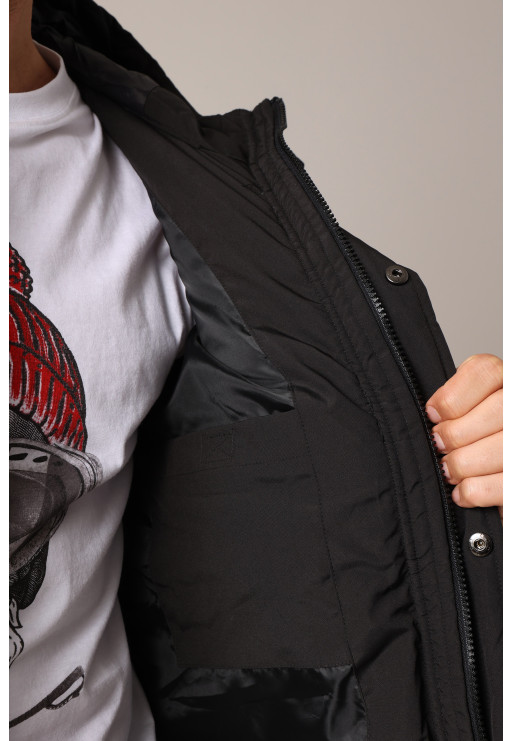 Sa coupe droite offre une silhouette structurée, tandis que les empiècements contrastés aux reflets légèrement satinés apportent une touche technique et moderne. La capuche intégrée est doublée pour renforcer la protection contre le froid.